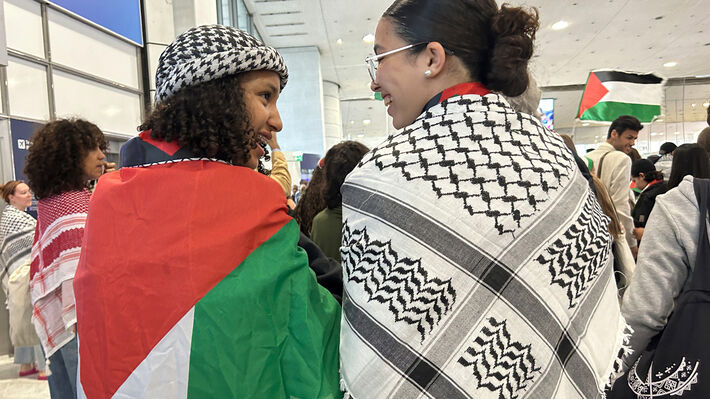 یازان البواب شناگر ۲۴ساله فلسطینی در فرودگاه خطاب به مردم گفت: «فرانسه فلسطین را به عنوان یک کشور به رسمیت نمیشناسد، بنابراین من اینجا هستم تا پرچم فلسطین را برافرازم.»