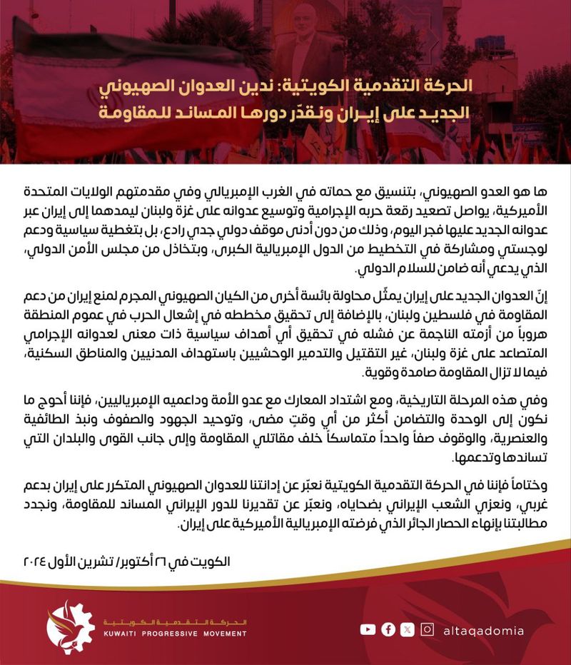 در پایان، ما در جنبش مترقی کویت تجاوزات مکرر رژیم صهیونیستی به ایران با حمایت غرب را محکوم میکنیم، و برای قربانیان آن به ملت ایران تسلیت میگوییم، و از نقش ایران در حمایت از مقاومت قدردانی میکنیم، و ما خواستار پایان دادن به محاصره ناعادلانه تحمیل شده توسط امپریالیسم آمریکا علیه ایران هستیم.