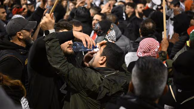 یکی از شرکتکنندگان در تظاهرات بعد از استفاده پلیس از اسپری فلفل علیه برخی از تظاهرکنندگان در مرکز مالمو عصر پنجشنبه، چشمان دیگری را میشوید.