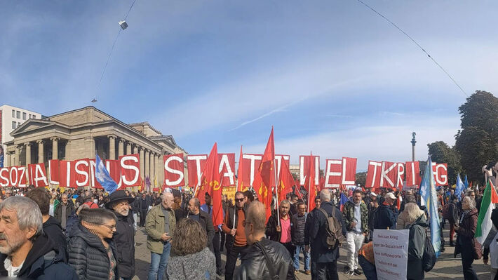 از این‌رو، بسیار مهم است که در سال‌های اخیر اعتصابات بخش‌ها و شرکت‌ها، اعتراضات علیه تمام مشکلات حاد مردمی و نسل‌کشی در فلسطین افزایش یافته است، و در تظاهرات بزرگ دوره قبل شعارهایی ظاهر شد که مسأله واقعی را در مرکز قرار می‌دهند. یکی از این شعارها، با صدها کارگر که پشت یک پرچم قرمز بزرگ که روی آن نوشته شده بود «سوسیالیسم به جای جنگ» جمع شده بودند، در تظاهرات اشتوتگارت ظاهر شد…